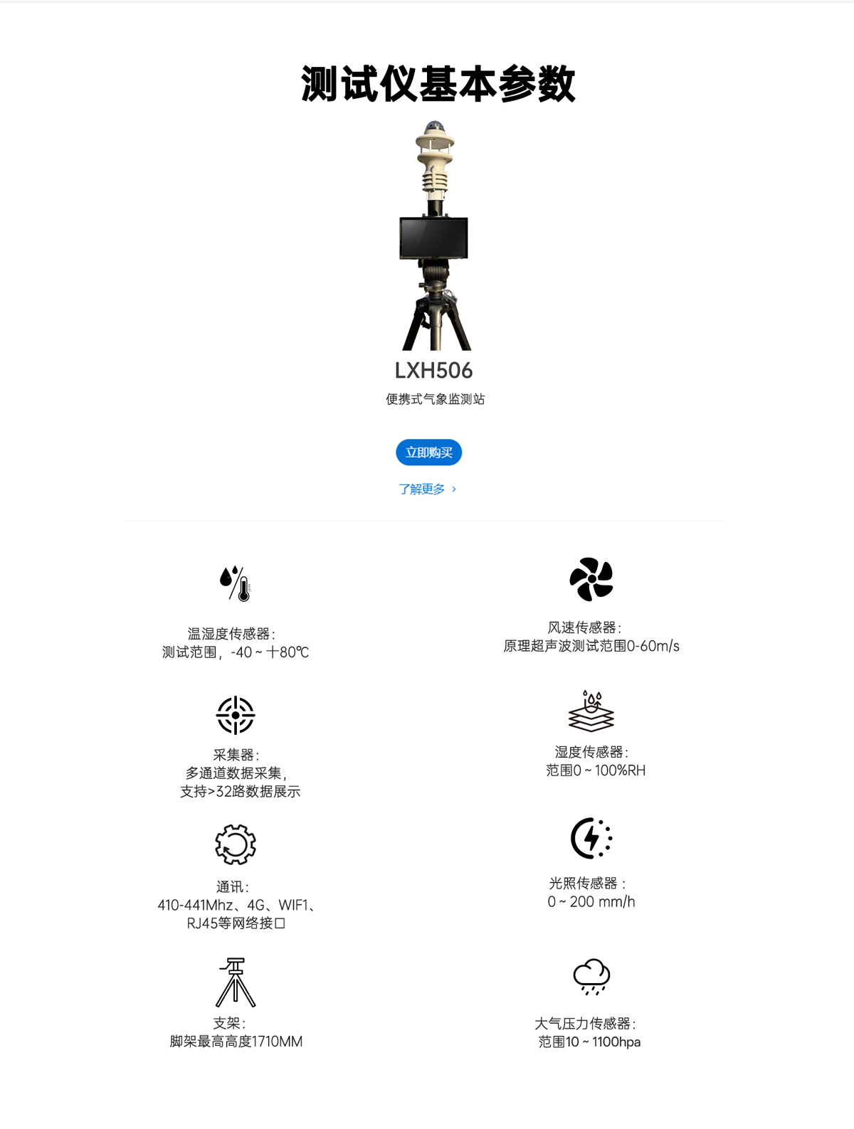 LXH506是一款便攜式氣象監測站,可隨身攜帶各個場地進行便捷的氣象采集工作,搭載超聲波微氣象LAILX-T5/LAILX-T6可實現風速、風向、大氣溫度、大氣濕度、大氣壓力、輻照度的測量。