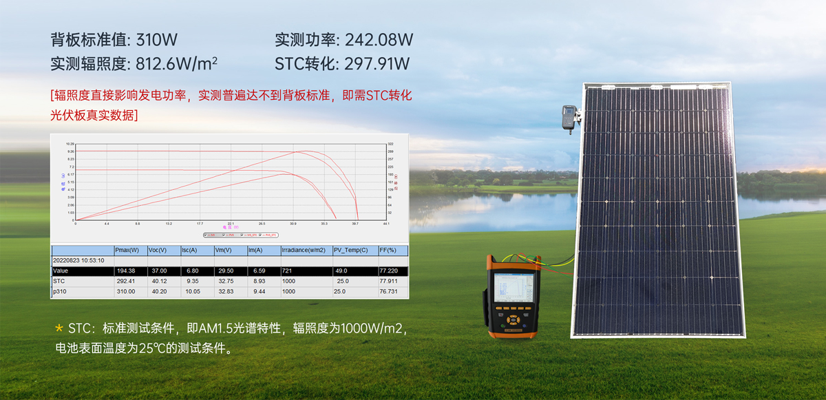 注***:光伏組件功率測試儀-PV30轉(zhuǎn)換到STC下最大功率準(zhǔn)確性指標(biāo)是在穩(wěn)定輻照度≥700W/m2,光譜滿足AM1.5條件下測得。在實(shí)驗(yàn)室條件下該指標(biāo)一般在2%以內(nèi)。現(xiàn)場測試時(shí),請?jiān)谔柟庹辗€(wěn)定條件下測試,并確保輻照度探頭與溫度探頭安裝可靠,否則會因?yàn)檩椪斩葴y試偏差及溫度偏差照成較大的轉(zhuǎn)換誤差。